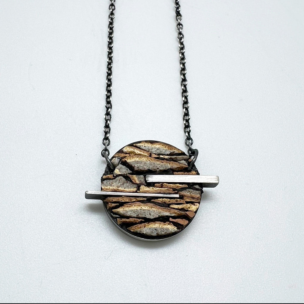 Handcrafted by local jewelry artist Aileen Lampman, these one-of-a-kind pendants are composed of sterling silver and original concrete fragments removed from Fallingwater during the World Heritage Preserved project. To create the pendant, the fragments are skillfully placed in the sterling silver bezel and secured with micro mosaic grout. Each pendant is placed on sterling silver chain.