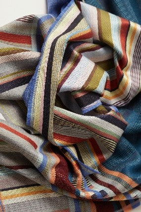 From the UK-based British designers Wallace & Sewell + Florence Hutchings, the Rosa scarf features a duo of bold lambswool woven on one-side with the silk stripe warp on the other. The border mixes both silk & lambswool in woven blocks and stripes, finished with a neat fringe.