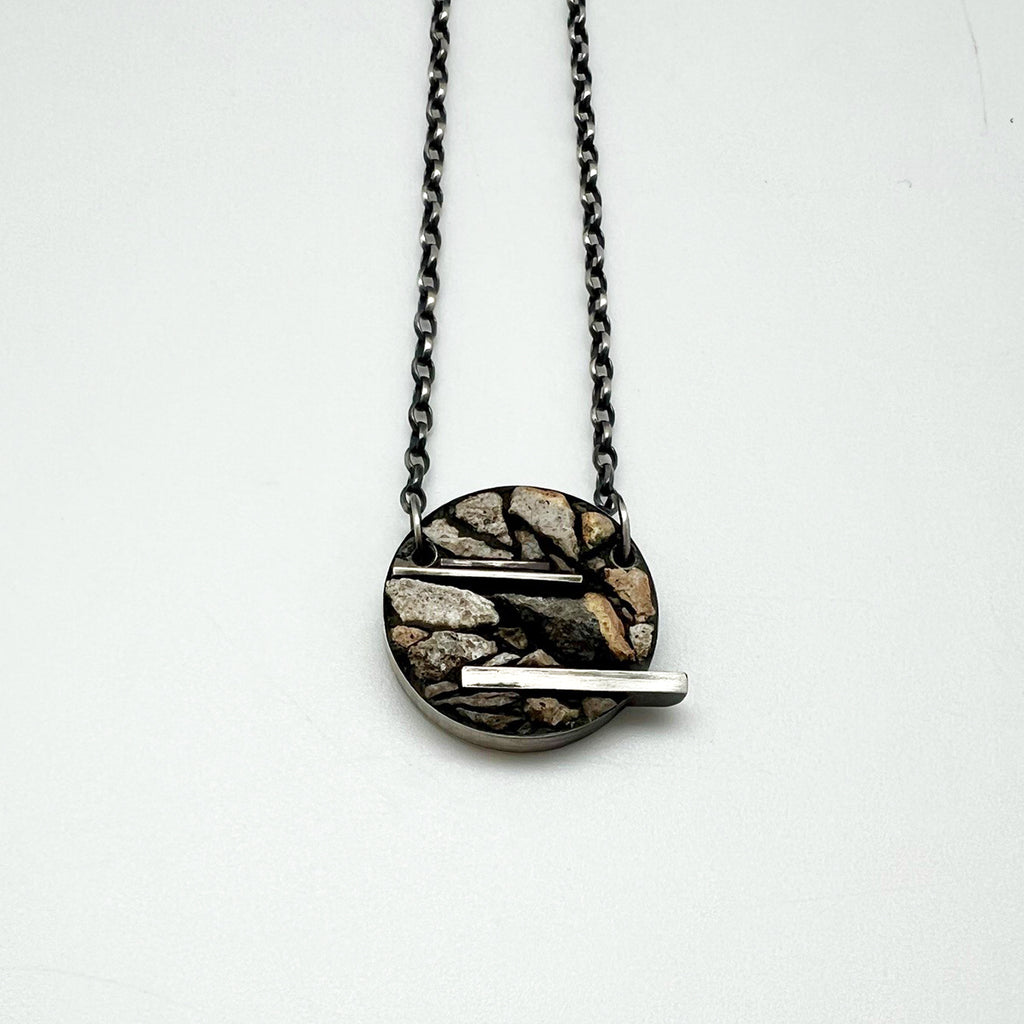 Handcrafted by local jewelry artist Aileen Lampman, these one-of-a-kind pendants are composed of sterling silver and original concrete fragments removed from Fallingwater during the World Heritage Preserved project. To create the pendant, the fragments are skillfully placed in the sterling silver bezel and secured with micro mosaic grout. Each pendant is placed on sterling silver chain.